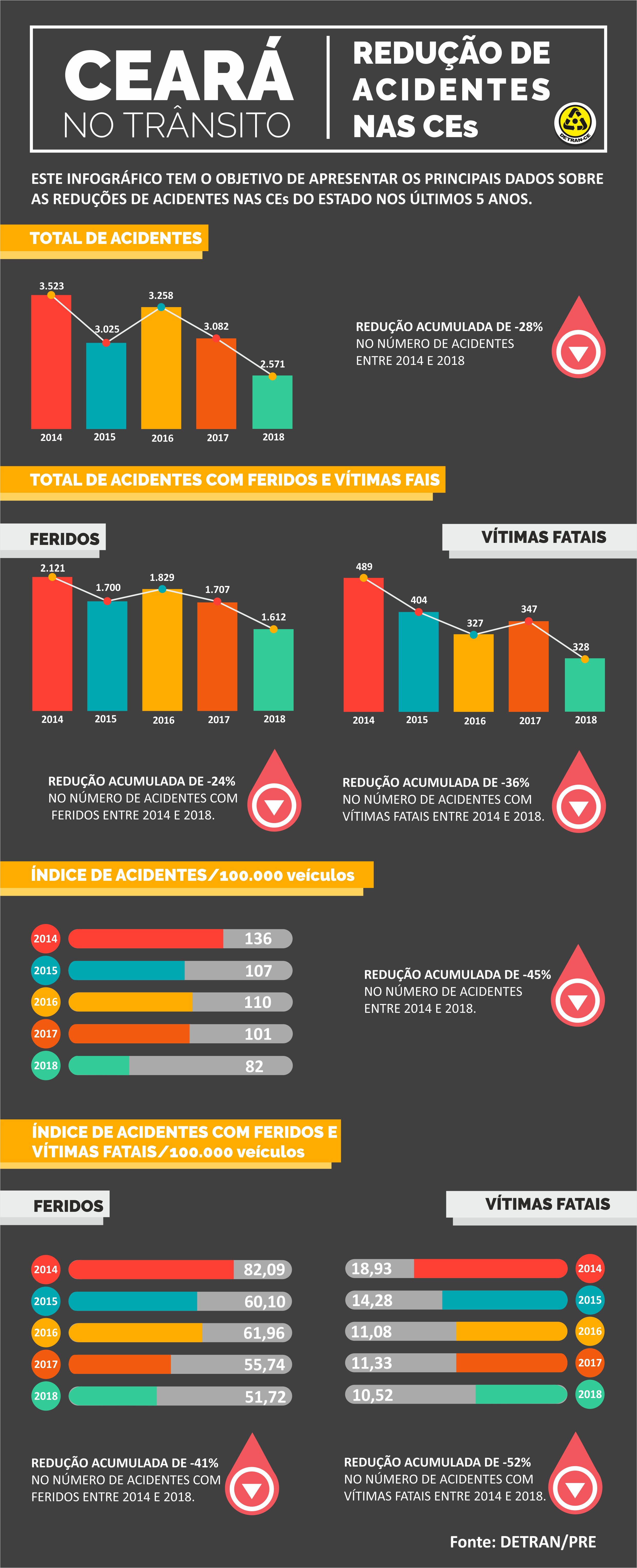 Nos últimos cinco anos, o Departamento Estadual de Trânsito do Ceará tem registrado uma redução acumulada dos principais índices de acidentes, feridos e mortos no trânsito. Mesmo considerando o aumento da frota de 18% e da malha viária estadual de 2014 a 2018, o índice de acidentes a cada 100.000 veículos reduziu 45% nas rodovias estaduais. Quando consideramos os acidentes com vítimas, as reduções são ainda mais expressivas, pois o número de mortos caiu 52% e o número de feridos 41%.