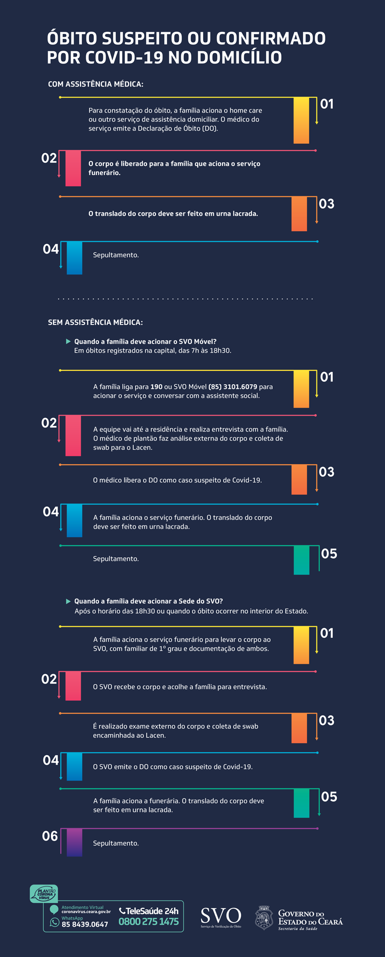 O Serviço de Verificação de Óbito Dr. Rocha Furtado (SVO), do Governo do Ceará, estabeleceu novas medidas de segurança durante a pandemia de coronavírus. Devido à incidência de Covid-19, o SVO passou a realizar a autopsia verbal, que inclui a realização de entrevistas com familiares próximos a quem faleceu e uma análise externa do corpo.